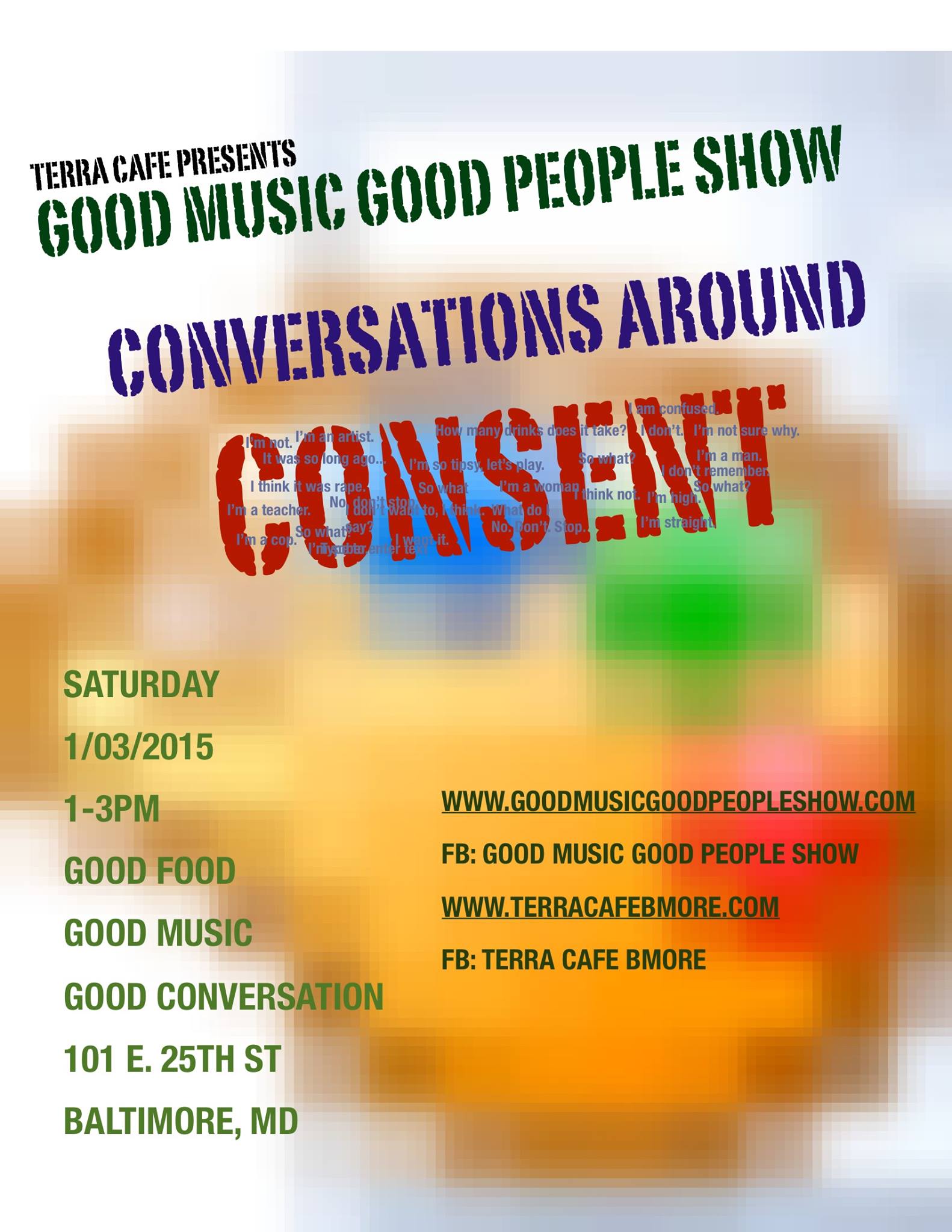 Good Music Good People Show hosted Conversations Around Consent at Terra Cafe in Baltimore on Saturday, January 3, 2015. It was a lively discussion and the point that is clear is that the conversation is very necessary.